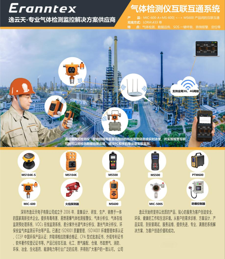 逸云天此次參展產(chǎn)品為氣體檢測(cè)儀、無(wú)線互聯(lián)互通氣體在線監(jiān)測(cè)系統(tǒng),適用于罐體檢修、化工園區(qū)內(nèi)有毒有害氣體及可燃性氣體的泄漏監(jiān)測(cè)報(bào)警,同時(shí)可以遠(yuǎn)程查看視頻監(jiān)控及數(shù)據(jù)濃度等。