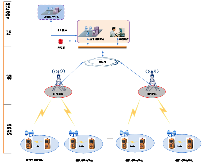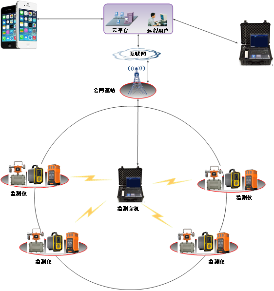 系統(tǒng)由區(qū)域監(jiān)測主機,區(qū)域監(jiān)測儀,便攜氣體檢測儀、移動APP及云平臺等部分組成。示意圖如下: